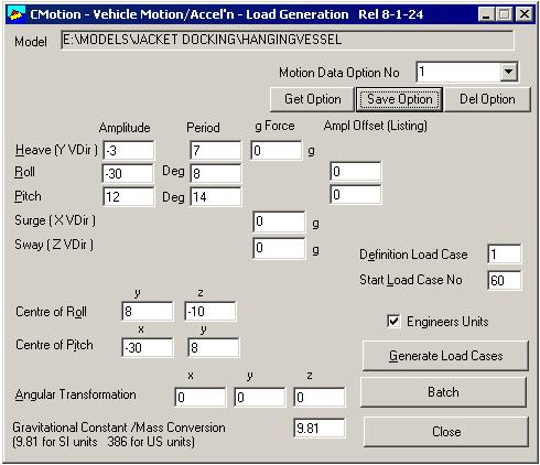FS-CMotion is a load processor for the generation of equivalent static structural loads resulting from the inertia forces and gravitational inclination forces developed from the type of motion associated with sea-going vessels. Forces due to the effects of heave, roll and pitch are accounted for.