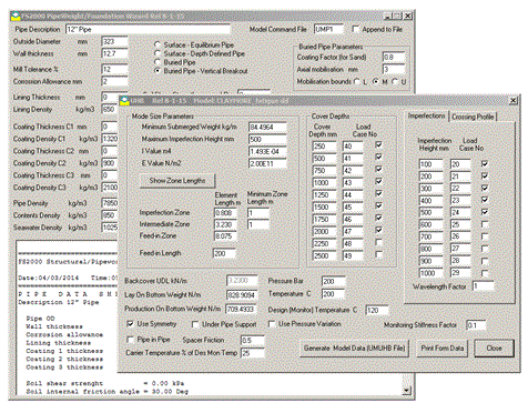A model generation wizard can be used to simplify the definition of properties, generation of the model and creation of the load cases. The evaluation of properties are based on the ASCE's "Guidelines for the Design of Buried Steel Pipe", 2001 or commonly used industry practice. Temperature profile can be easily mapped to the pipeline element mashes. This utility can be used to generate models for: